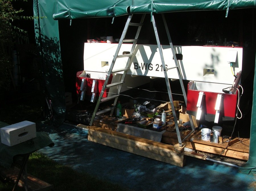 Hello John, thank you for your welcome. Regarding my boat building project: I was starting in a former garage which was just large enough to allow the build of one semi hull at a time. So I had to erect a tent (4 m by 8 m) in my garden to accomodate the further assembling of the boat. I'm reporting ...