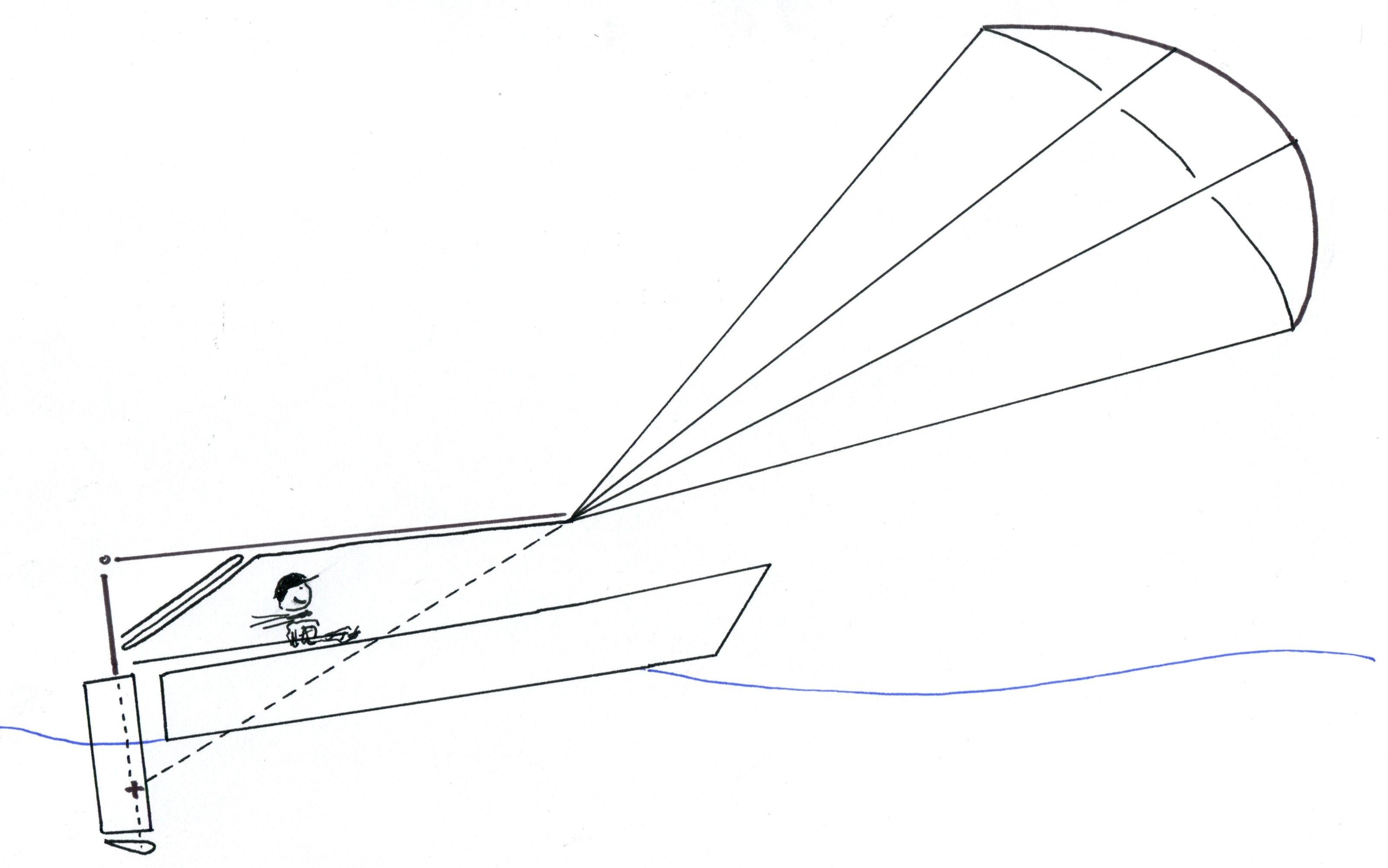 The sketch illustrates how the rig is arranged so that the drive force from the kite acts directly through the centre of lateral resistance ... so the boat does not heel. As the kite moves the boom follows the kite with the result that the drive force continues to work through the centre of lateral resistance - that's been tested several times and works well.